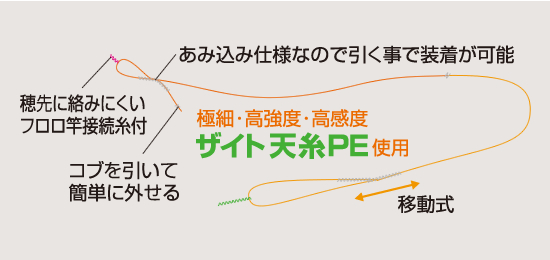 細強・超高感度天糸仕掛、極細で高感度・高強度のZaito天上道糸PEを使用。4本組だから編込みを移動させてもヨレない。竿へのカラミを防ぐため、竿接続部は50cmのフロロカーボン接続糸付。