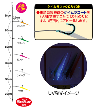 集魚効果抜群のケイムラコートをハリまで施すことにより他のサビキより圧倒的にアピールします。