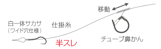手返し速攻、移動鼻かんスイフト仕掛。半スレサカサ、ワイド穴仕様で通しやすく、ハリス切れしにくい。