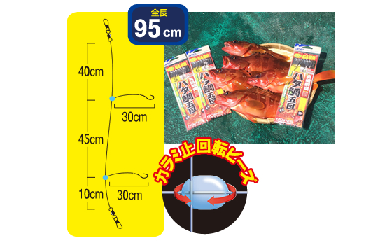ハリは軽量かつ強度の高い「小鯛鈎」を使用。活きエビや切り身・冷凍エサなど様々なエサに対応、根魚のみならずマダイや石鯛・カワハギなども狙えます。