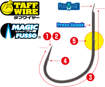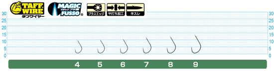 さらにマジックフッ素コートを施すことにより、初期掛かり、 貫通性、ハリ先の耐久性に優れ、通常線材よりも 鋭すぎるロングテーパーに仕上げることができました。