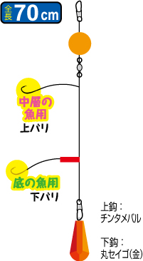 | M | 上:1.5号/下:2号 | 4 | ¥400 | 70cm | 上バリ:チンタメバル8号/下バリ:丸セイゴ(金)10号 | オモリ:10号 | 4953873285950 |