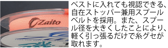 ベストに入れても視認できる、自在ストッパー兼用スプールベルトを採用。