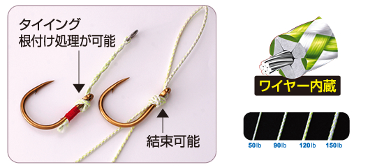 7×7のしなやかなステンレスワイヤーの外周に、高密度ポリエチレンとナイロン素材を追い打ちで密に組み上げたワイヤーコアのブレイデッドラインです。ワイヤーだけでは不可能だった「結束」と「根付け」を可能にしたことはアシストフックの創造に大きな可能性を拡げます。擦れに対してはワイヤーが、引張りにたいしてはパワーフレックスが、それぞれ強度を発揮しながら機能します。太刀魚やサワラ等の「ナイフ歯系魚種」に対する有効度は申し上げるまでもありません。