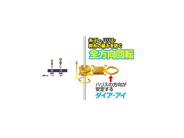 糸ヨレ、ハリス幹糸の絡みを防ぐ全方向回転と活エサに負担をかけない軽量タイプ。