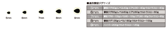 7mm:撃投ジグ85~105g・レベル80~130g・エアロ80~95g・ウルトラスロー80g