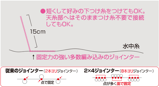 金属ライン・複合ラインの接続に。細糸多本数ヨリ糸(0.1号×4本×2ヨリ)で固定がすごい!細糸の多本数で編み込むことにより、点での固定が面での固定に。だから固定力が強い!「特許第3862961号 ライセンス商品」