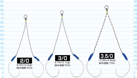 | 3/0 | ¥550 | レーシングスペック中深海専用チューン | ハリ:6.7lb(3.1kg)、組糸:50lb | マイクロソリッドリング#3.5 | 4953873177521 |