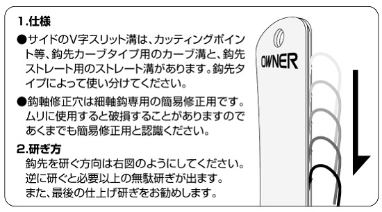 鈎先を研ぐ方向は右図のようにしてください。逆に研ぐと必要以上の無駄研ぎが出ます。また、最後の仕上げ研ぎをお勧めします。