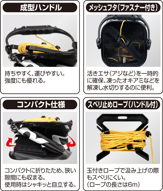 活きエサ(アジなど)を一時的に確保、凍ったオキアミなどを解凍し水切りするのに便利。