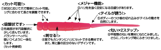 甲殻類系の味を練りこみ、甲殻類系の匂いを吹きつけ、一定の集魚効果を実感できます。