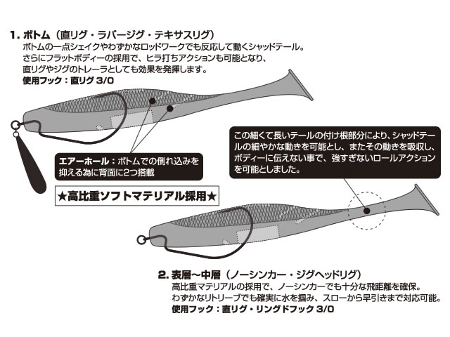 通常のシャッドテール型のソフトベイトと違ういテールの付け根部分を細くすることでわずかなアクションでもしっかり動きながらテールの動きをボディーに伝えないことで強すぎないロールアクションを実現しました。