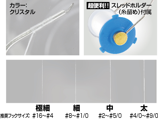 | 極細 | ¥650 | クリスタル | 参考号数:約0.15号 | 長さ:40m | 4953873218637 |