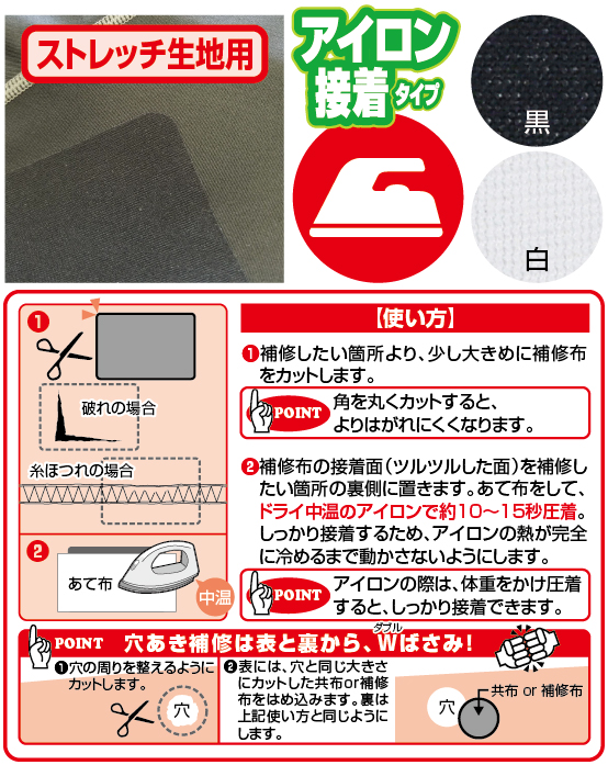 スポーツインナー、レギンスのような薄地ストレッチ生地の穴、破れ、キズをアイロンで簡単に接着修復できます。もちろん洗濯もOKです。
