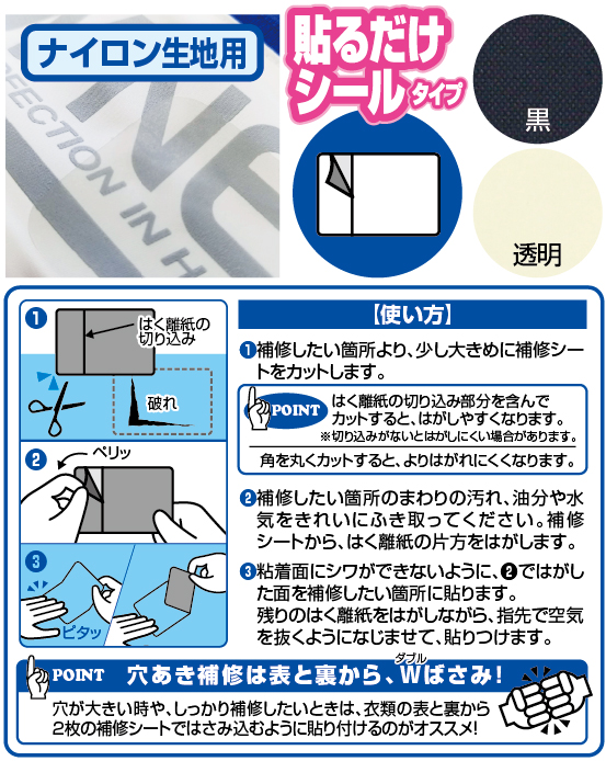 ダウンやレインウェアのようなナイロン生地の穴、破れ、キズを貼るだけで補修できるシートです。もちろん洗濯もOKです。