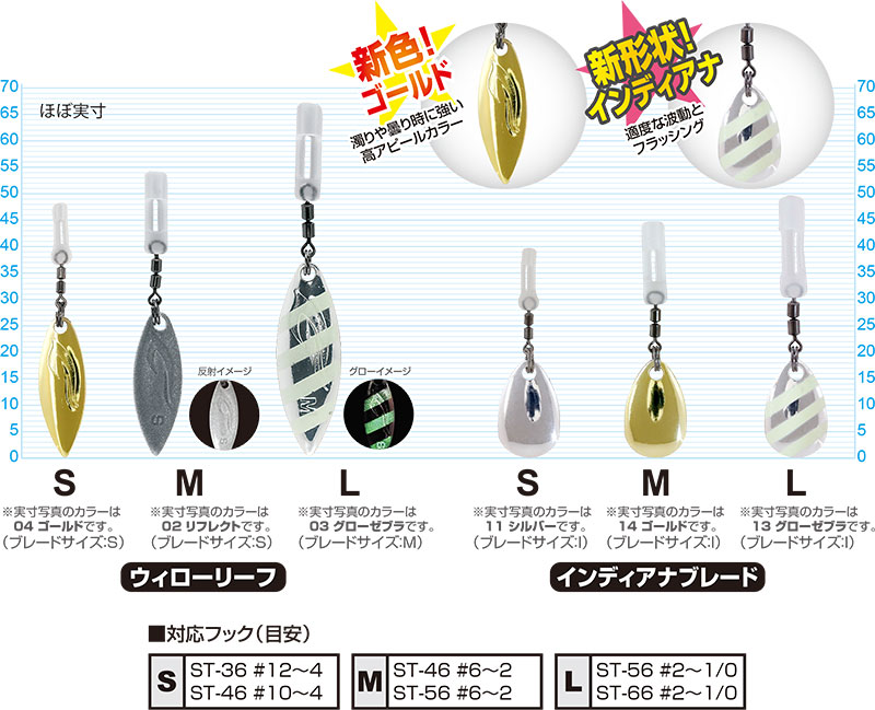 | L | ¥700 | 03グローゼブラ | ブレード:ウィローリーフM | 対応フック(目安):ST-56#2~1/0、ST-66#2~1/0 | 4953873278990 |