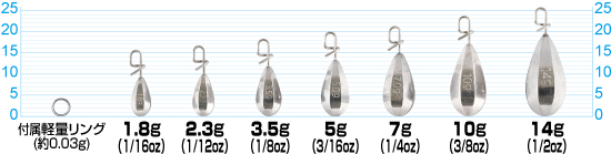 | 14g | ¥700 | 1/2oz | 個数(シンカー/軽量リング):1pcs/1pcs | 4953873309731 |