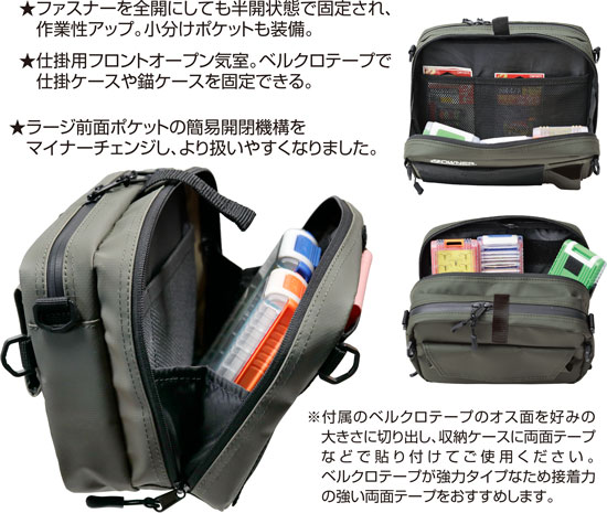 ●仕掛用フロントオープン気室。ベルクロテープで仕掛ケースや錨ケースを固定できる。