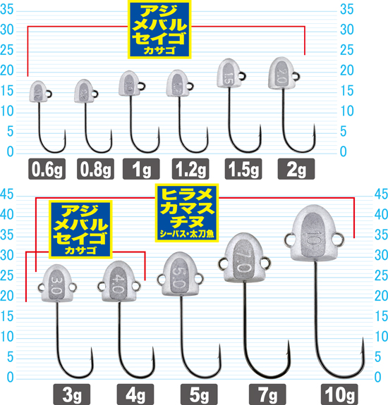 ●1g以下のフックは中軸設定、良型アジ・メバルにばっちり対応。2g以上は細軸設定。