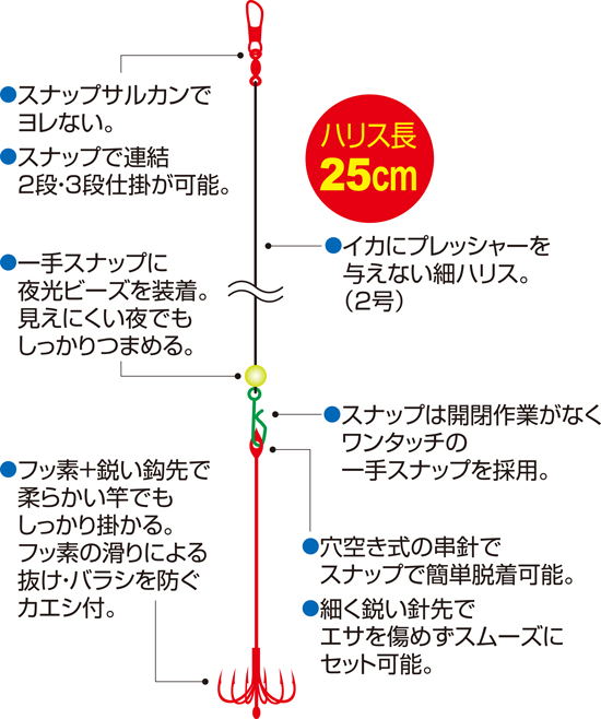 ・スナップ式の串針なのでエサ部をフグに噛まれても糸が切れない。