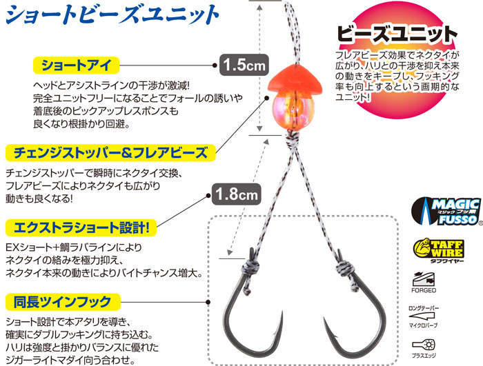 フレアビーズ効果でネクタイが広がり、ハリとの干渉を抑え本来の動きをキープし、フッキング率も向上するという画期的なユニット!