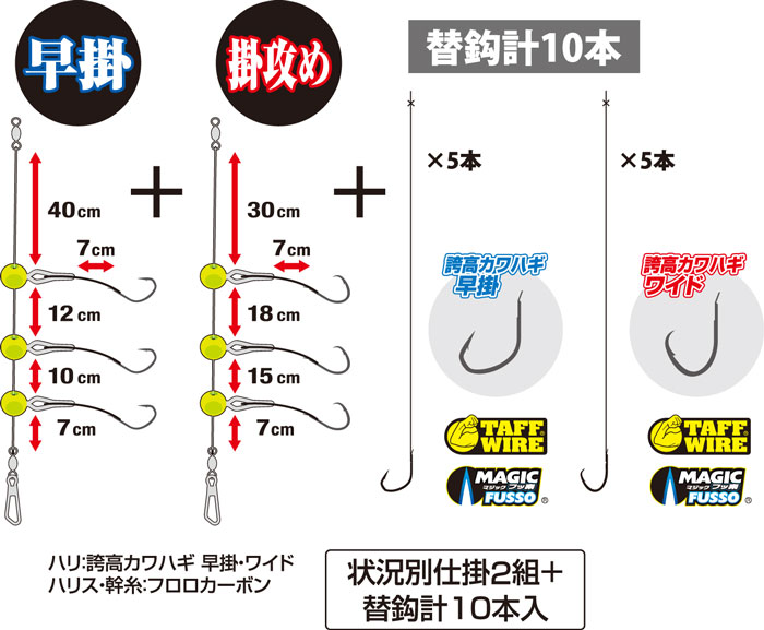 | 8/5.5 | 3/3 | 4 | ¥1,050 | 誇高カワハギ早掛/ワイド | 状況別仕掛2組+替鈎計10本入り | 替えバリ(早掛/ワイド):各5本 | 4953873314896 |