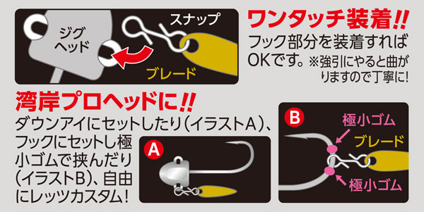 ダウンアイにセットしたり(イラストA)、フックにセットし極小ゴムで挟んだり(イラストB)、自由にレッツカスタム!