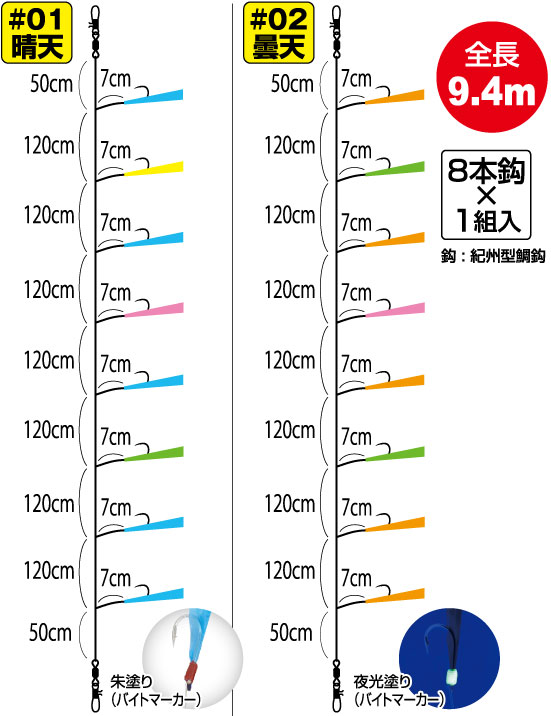 | 12 | 12 | 16 | ¥800 | 9.4m | 紀州型鯛鈎 | #01 晴天カラー | 4953873313868 |