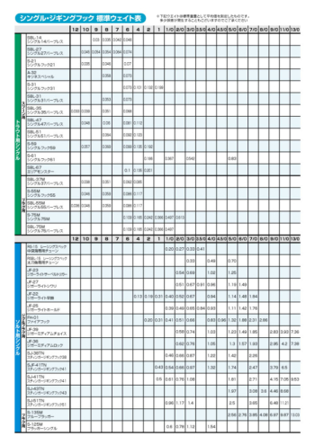 | 号数 | 希望本体価格 | 強度 | 重量(標準ウェイト・自重) | 備考1 | JANコード |