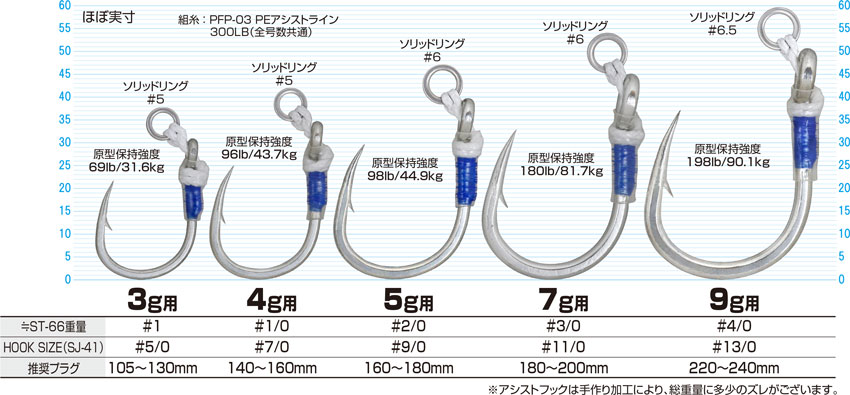 | 3g用 | ¥550 | SJ-41#5/0 | 69lb(31.6kg) | 推奨プラグ:105~130mm | 4953873319761 |
