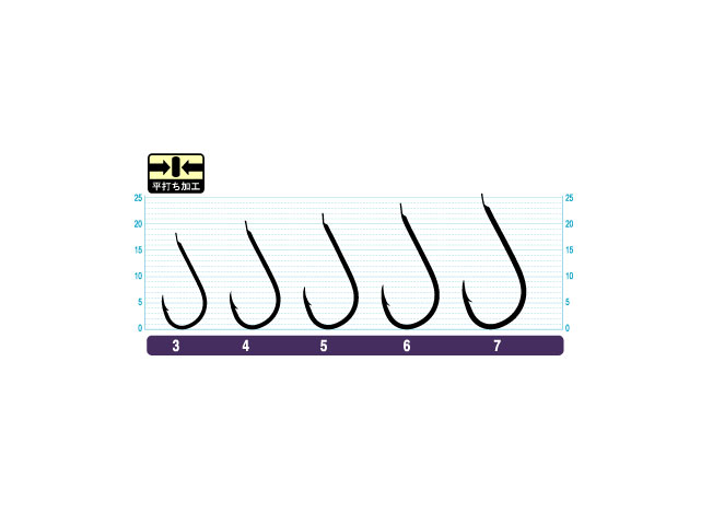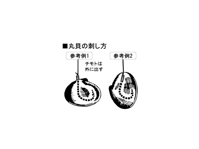 アケミの丸貝を使う場合、貝にさしやすいよう胴を平打ちにし、餌付けの簡便さと、廻らずに落下等、最も神経を使ったチヌ鈎の一つです。