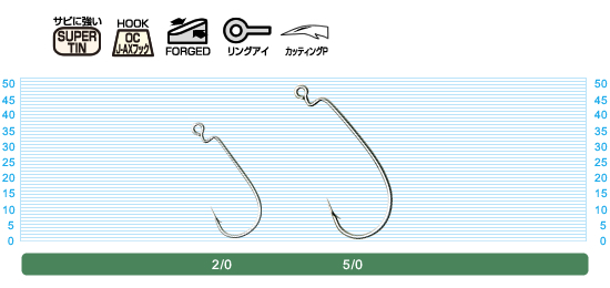 ジョイントアックス専用の交換フックです。たとえば、3/16や1/4の純正フックは2/0ですが、5/0のフックをセットすることでドシャローの大型スズキのフッキングを万全にすることが可能になります。