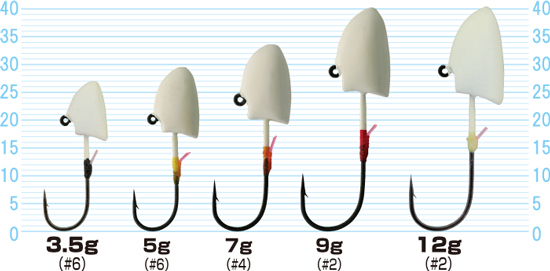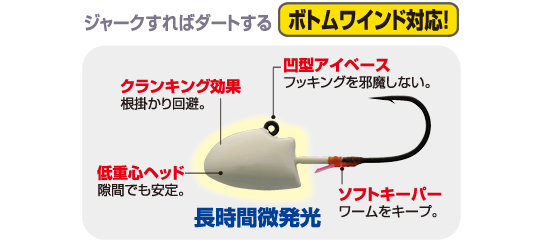 微発光が長時間持続するヘッドで形状は低重心で障害物を乗り越えるボトムのズル引きをコンセプトにした独特形状。カサゴやアイナメ等の根魚の食欲を刺激する専用ジグヘッド。
