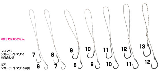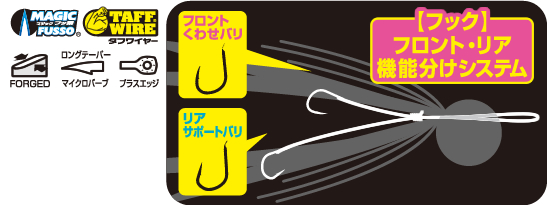 フロントフックにはジガーライトマダイ向う合わせを使用し、喰わせバリとしてがっつり口に貫通させ、リアフックにはジガーライトマダイ早掛を使用し、サポートバリとしてしっかり口周りに外側から掛ける『究極のフックシステム』です。