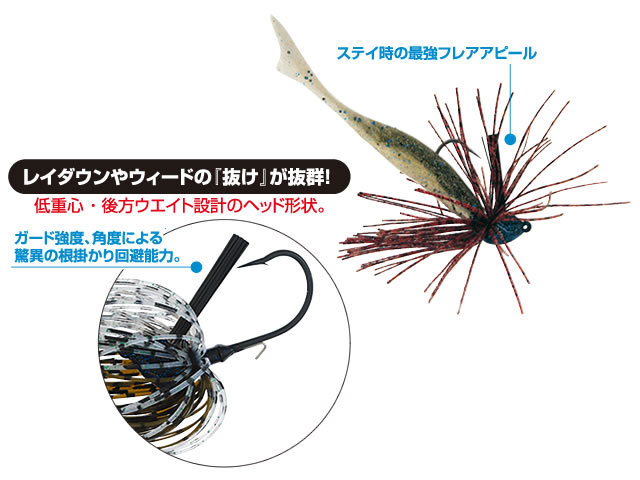 テーマはアピール力と根掛かり回避能力、特にストラクチャー周りをタイトに攻められるジグ。テスト&エラーを繰り返し、ようやく実現した低重心、後方ウェイトによるステイ時のアフレアピールと独自形状と計算されたガード強度・角度によるレイクダウンやウィードへの【抜け】。どんな悪路も乗り越えて魚をとる性能に特化しました。