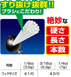 そこでジグヘッドにカバーをぶち抜ける強さとフッキングを妨げない絶妙の長さ、本数、硬さを追求したブラシを装着。
