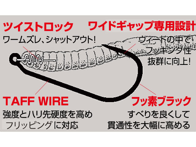 ツイストロックによりワームのズレを激減しながらフッキング性能を重視したワイドギャップモデル。