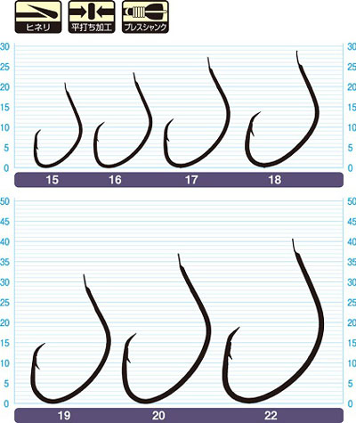 超軽量だから抜群に喰い込みが良く、根魚専用のヒネリが喰わえた魚を見逃さない。さらに、根掛かりしにくいフォルムがスピーディーに釣果を生みます。プレスシャンクPAT.Pによりハリスの回りやズレを防止する。