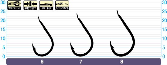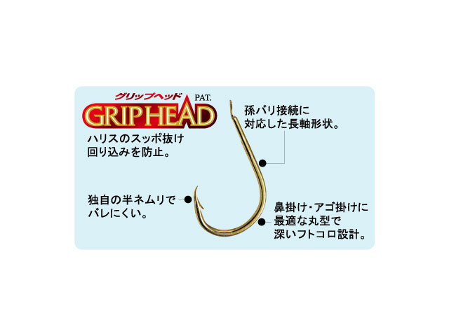 アジの鼻掛け・アゴ掛けに最適な丸型で深いふところ形状。外れにくい半ネムリ仕様と孫バリ接続に対応した長軸設計。そしてメータークラスのヒラメや不意の大物にも耐えうる強度を保有しています